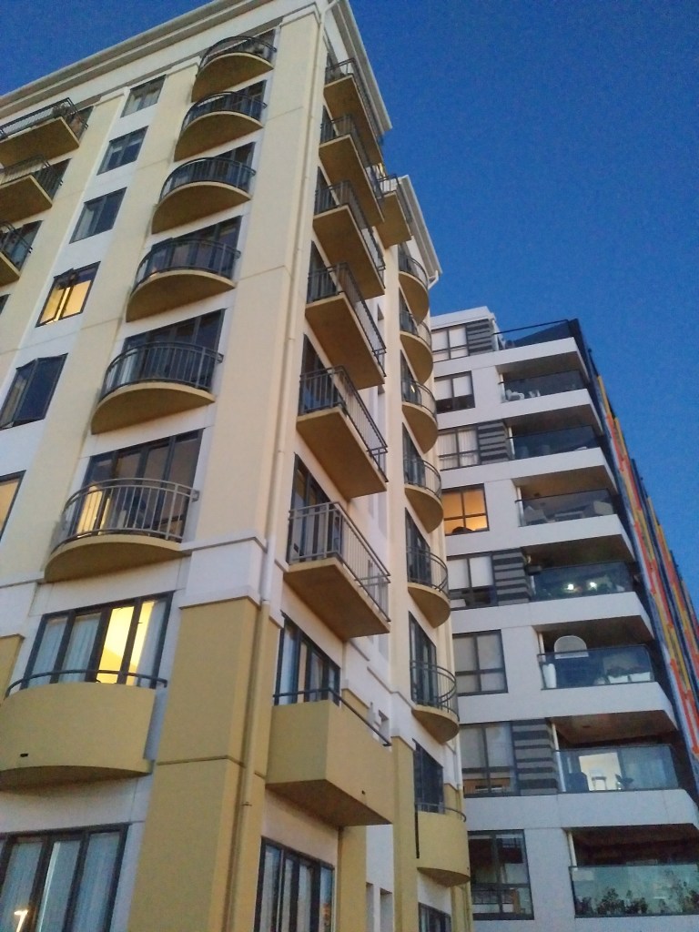 Ganz zuoberst, im 9.Stock des gelb bemalten Hochhauses, ist unsere 2-Zimmer Mietwohnung.