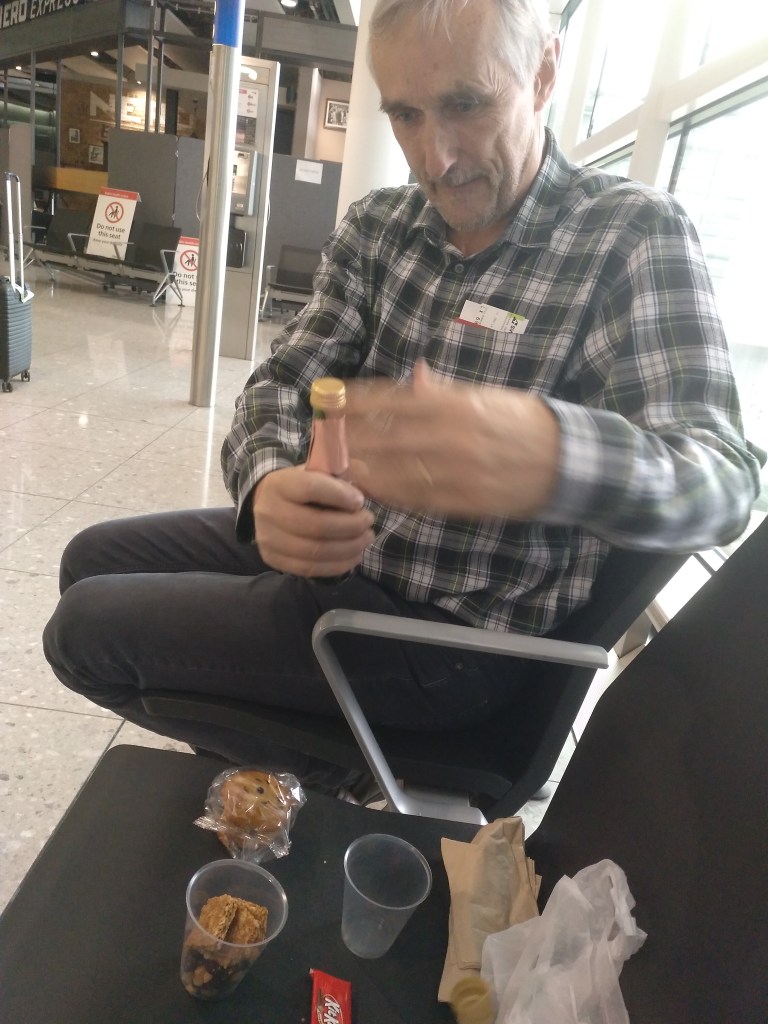In Los Angeles konnten wir ein 2dl Fläschchen Prosecco kaufen. Nach dem geglückten  „Gump“ nach Europa haben wir in London stolz und erleichtert mit Plastikbechern aus dem Flugzeug angestossen.